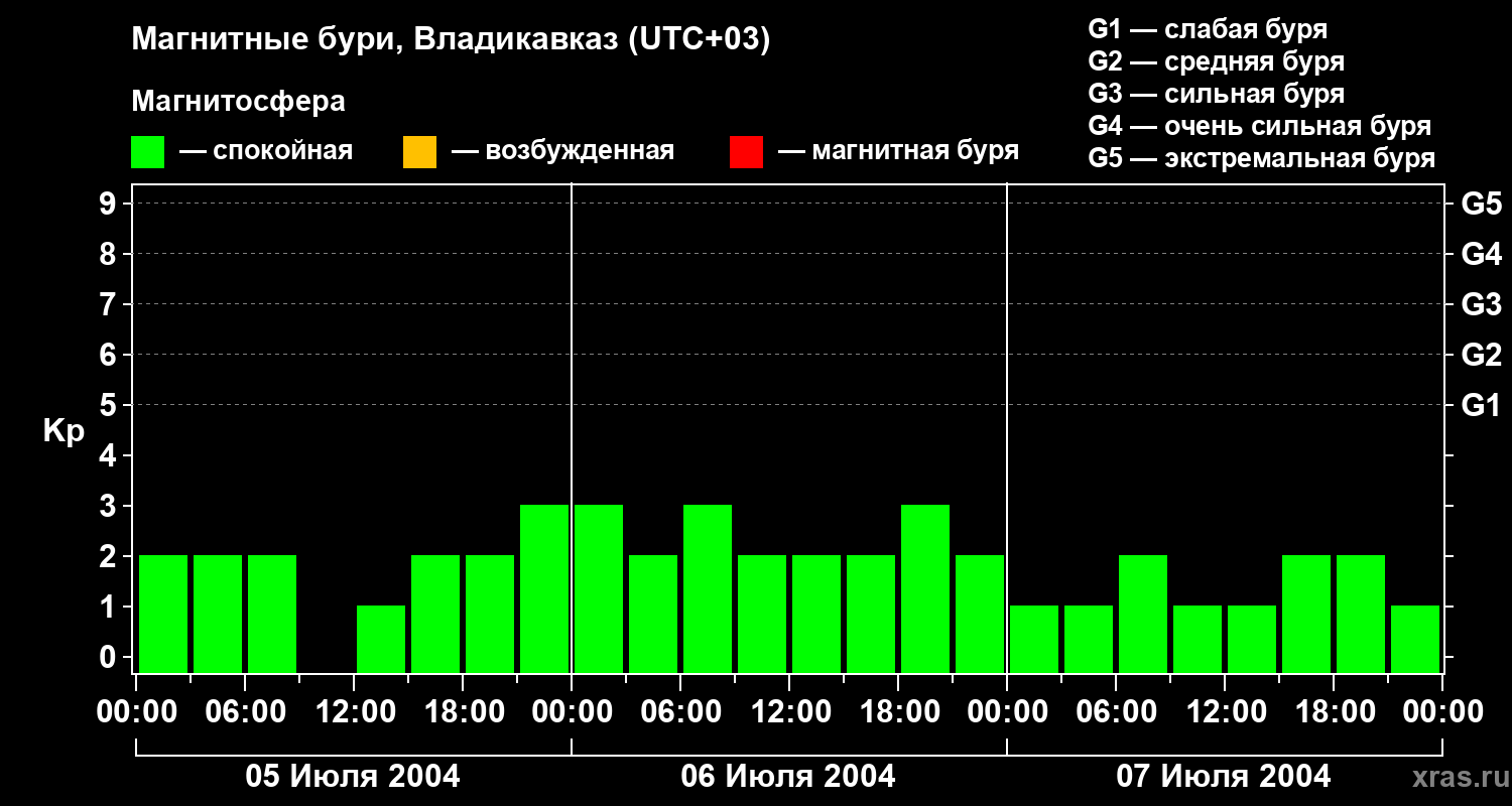 Изменения геомагнитного индекса Kp с 5 по 7 июля 2004 года для средних широт