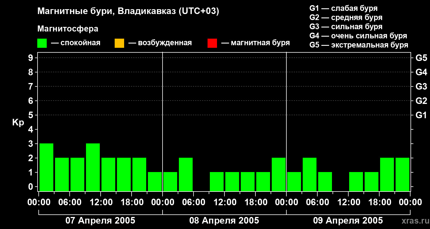 Изменения геомагнитного индекса Kp с 7 по 9 апреля 2005 года для средних широт