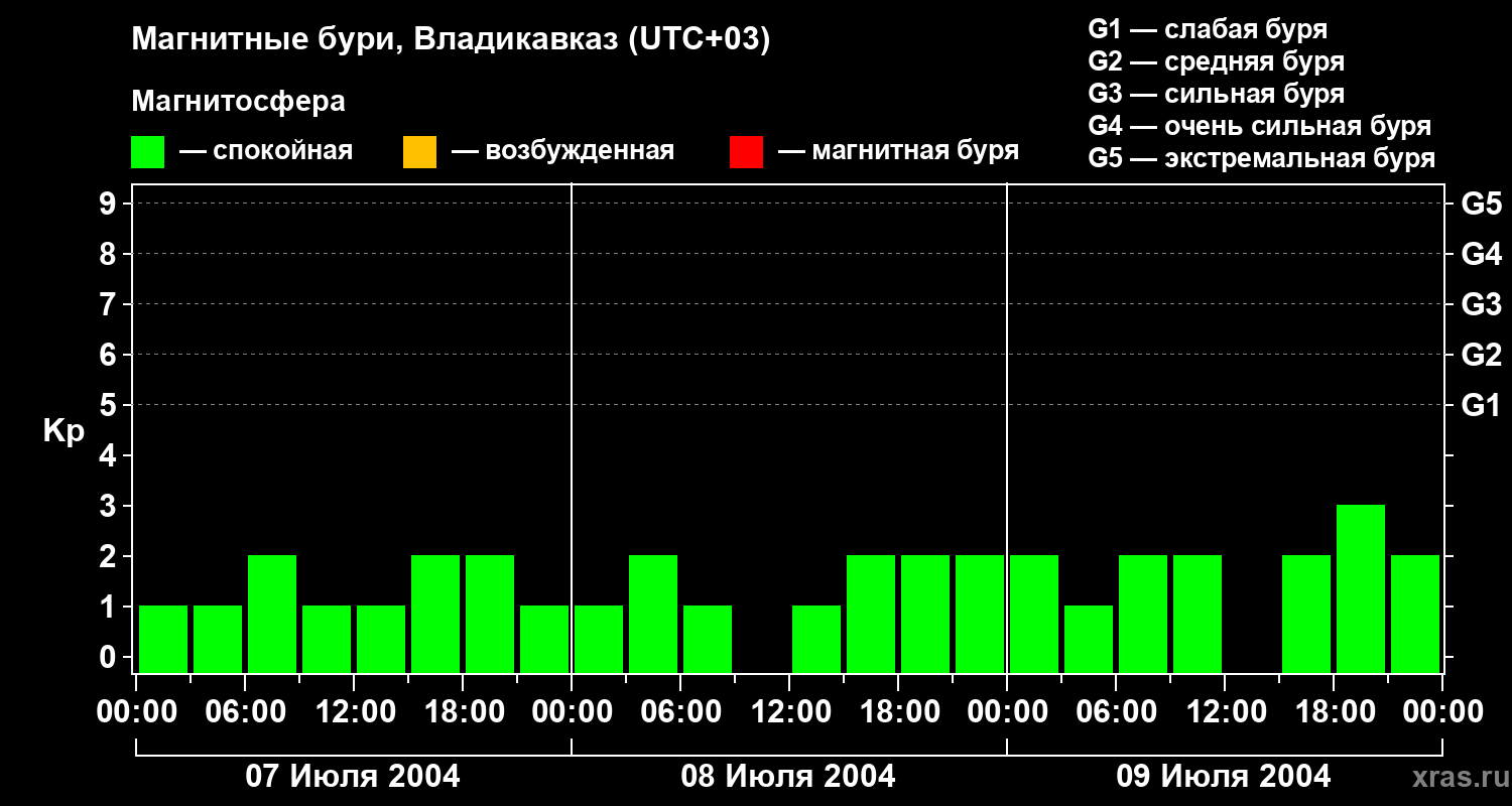 Изменения геомагнитного индекса Kp с 7 по 9 июля 2004 года для средних широт