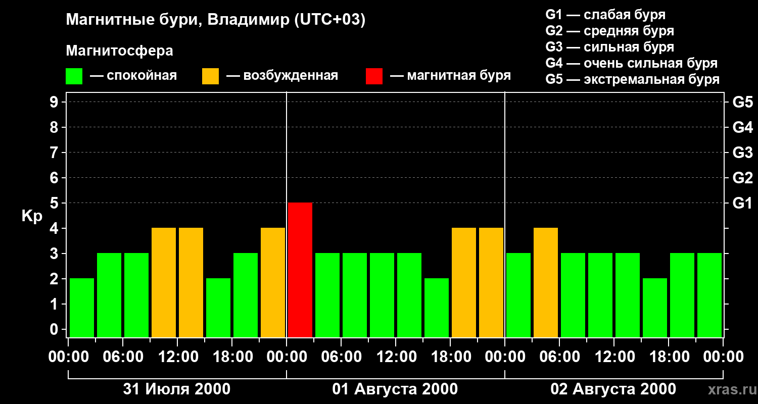 Изменения геомагнитного индекса Kp с 31 июля по 2 августа 2000 года для средних широт