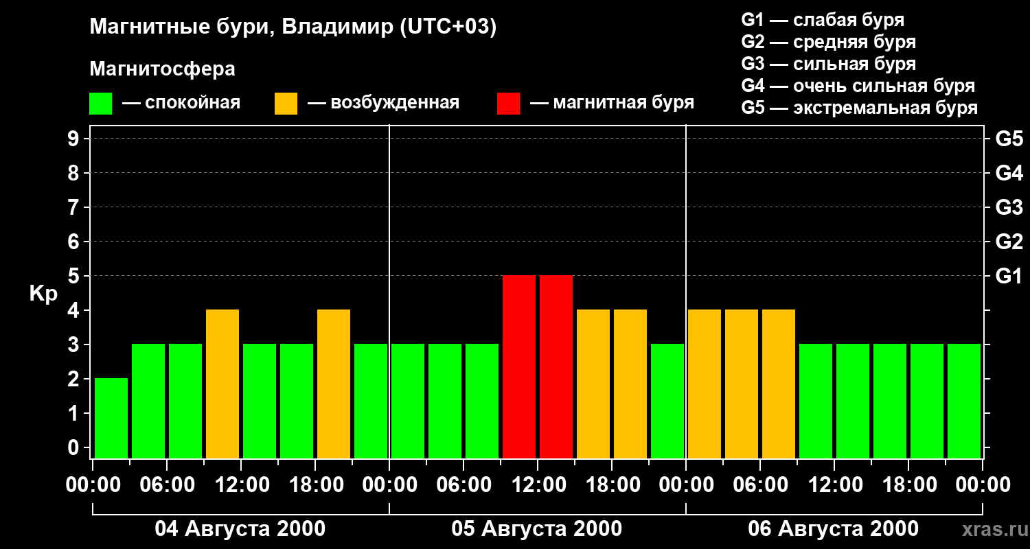 Изменения геомагнитного индекса Kp с 4 по 6 августа 2000 года для средних широт