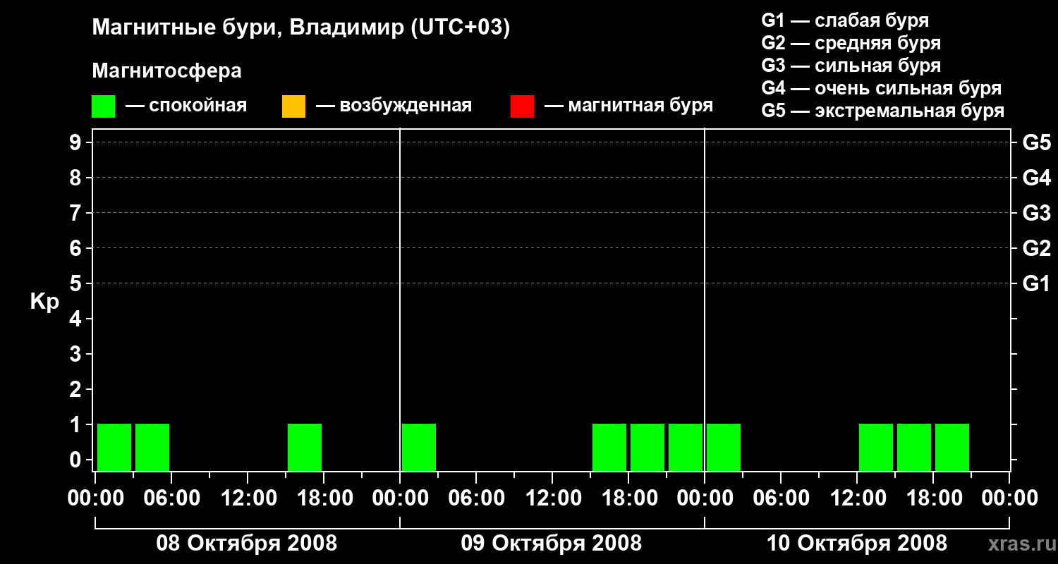 Изменения геомагнитного индекса Kp с 8 по 10 октября 2008 года для средних широт