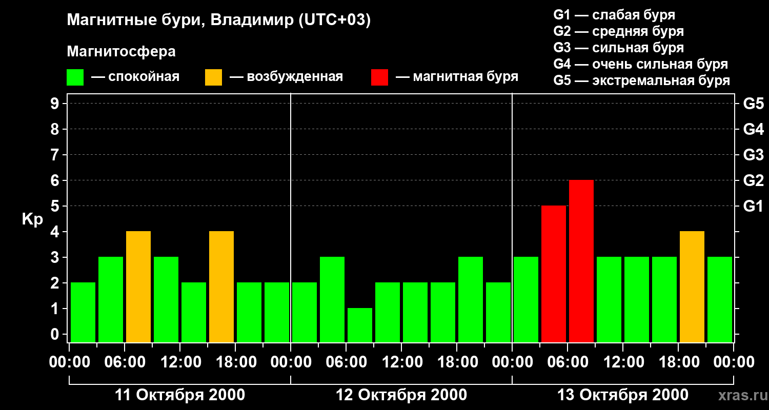 Изменения геомагнитного индекса Kp с 11 по 13 октября 2000 года для средних широт