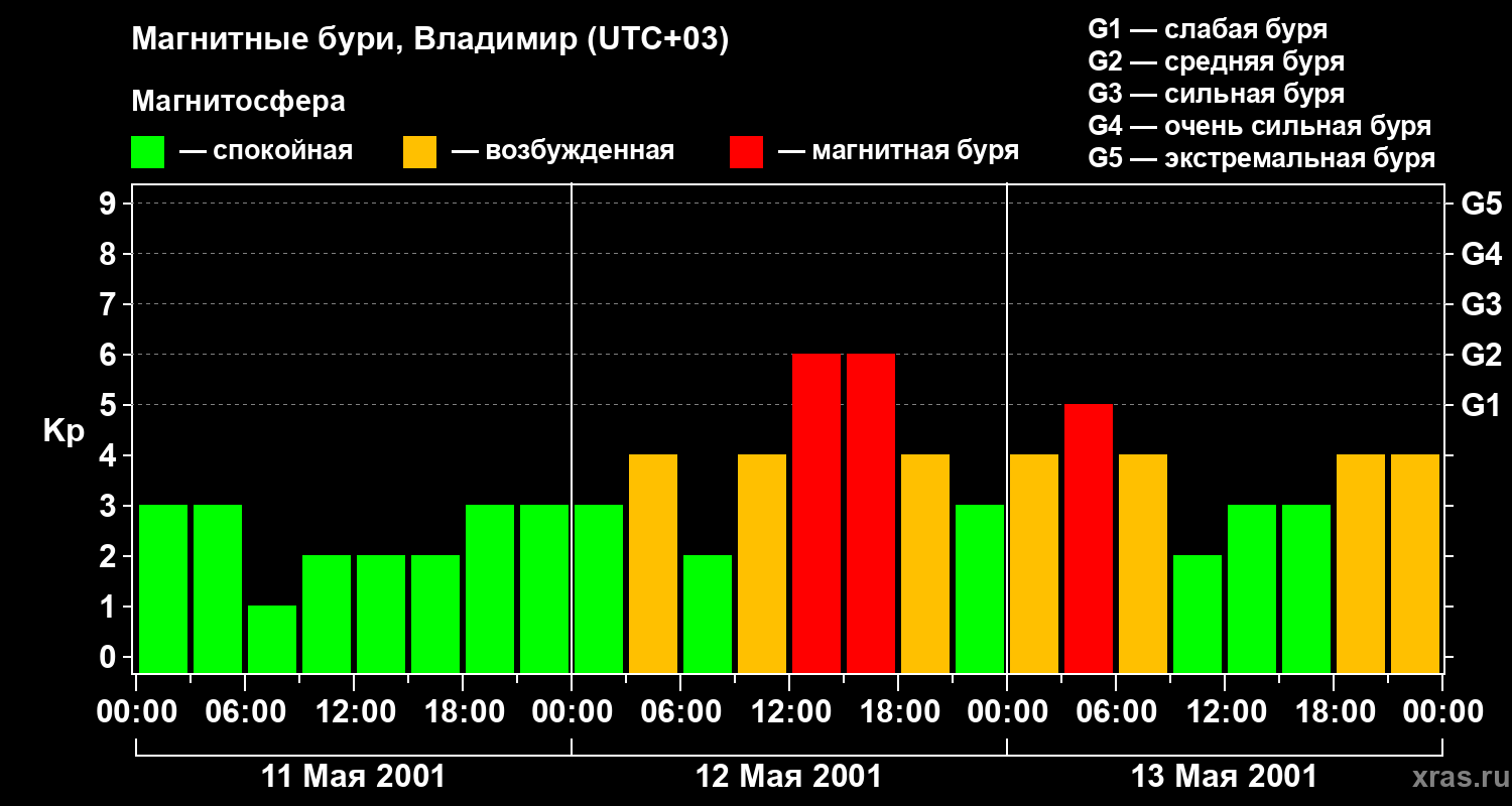 Изменения геомагнитного индекса Kp с 11 по 13 мая 2001 года для средних широт