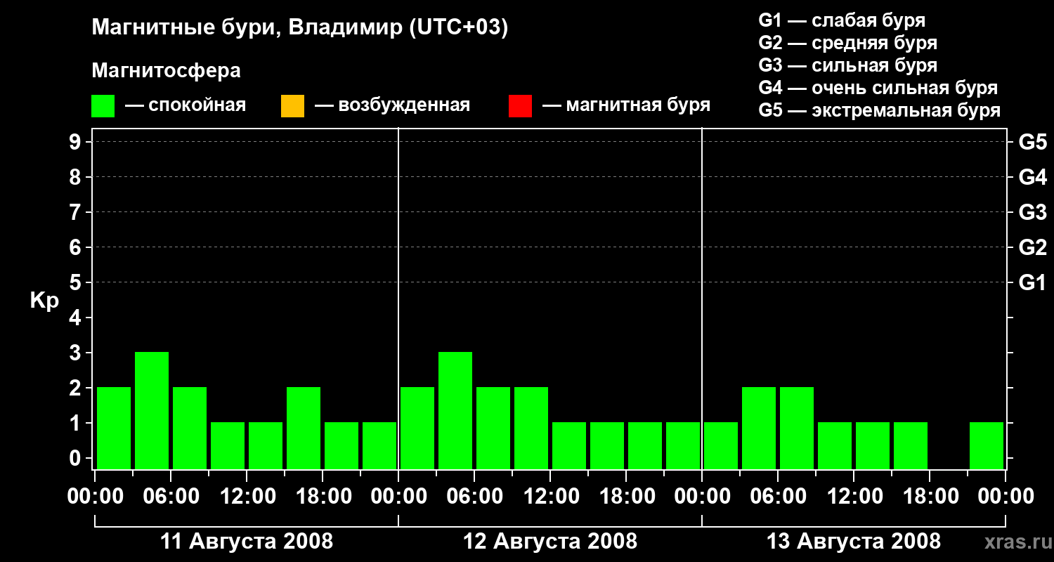 Изменения геомагнитного индекса Kp с 11 по 13 августа 2008 года для средних широт