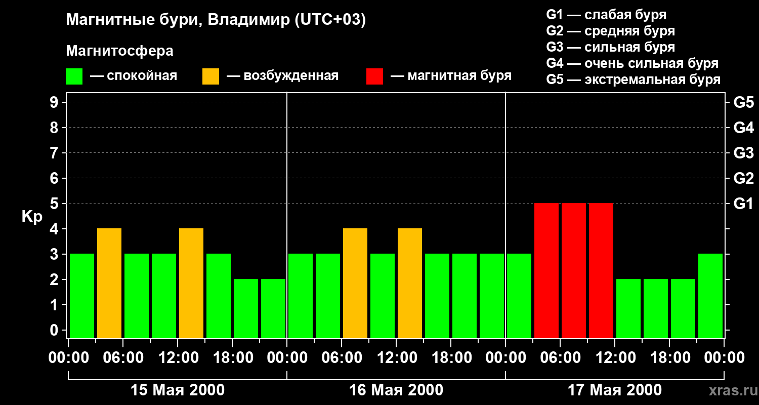 Изменения геомагнитного индекса Kp с 15 по 17 мая 2000 года для средних широт