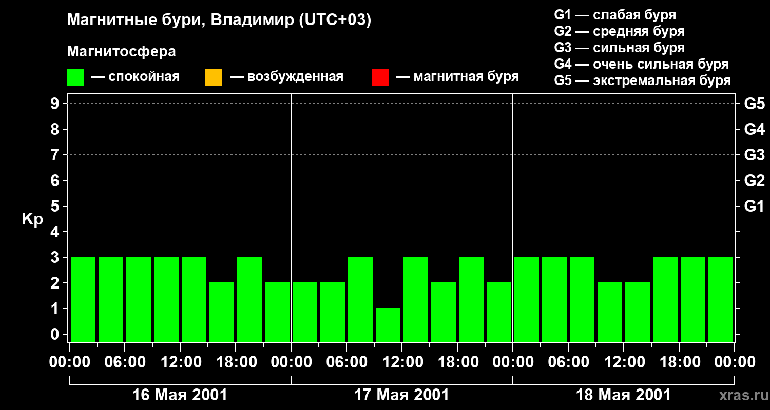 Изменения геомагнитного индекса Kp с 16 по 18 мая 2001 года для средних широт