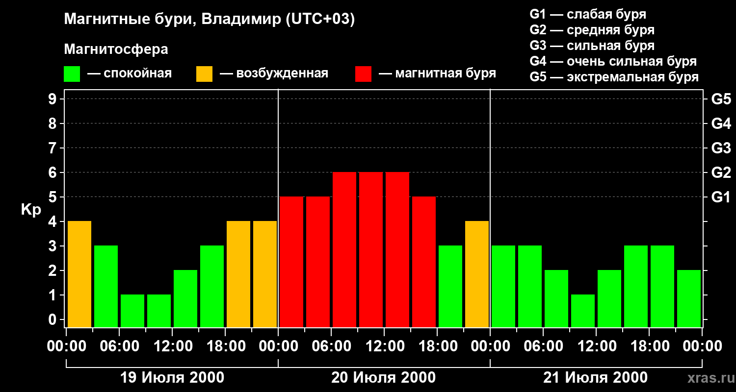 Изменения геомагнитного индекса Kp с 19 по 21 июля 2000 года для средних широт