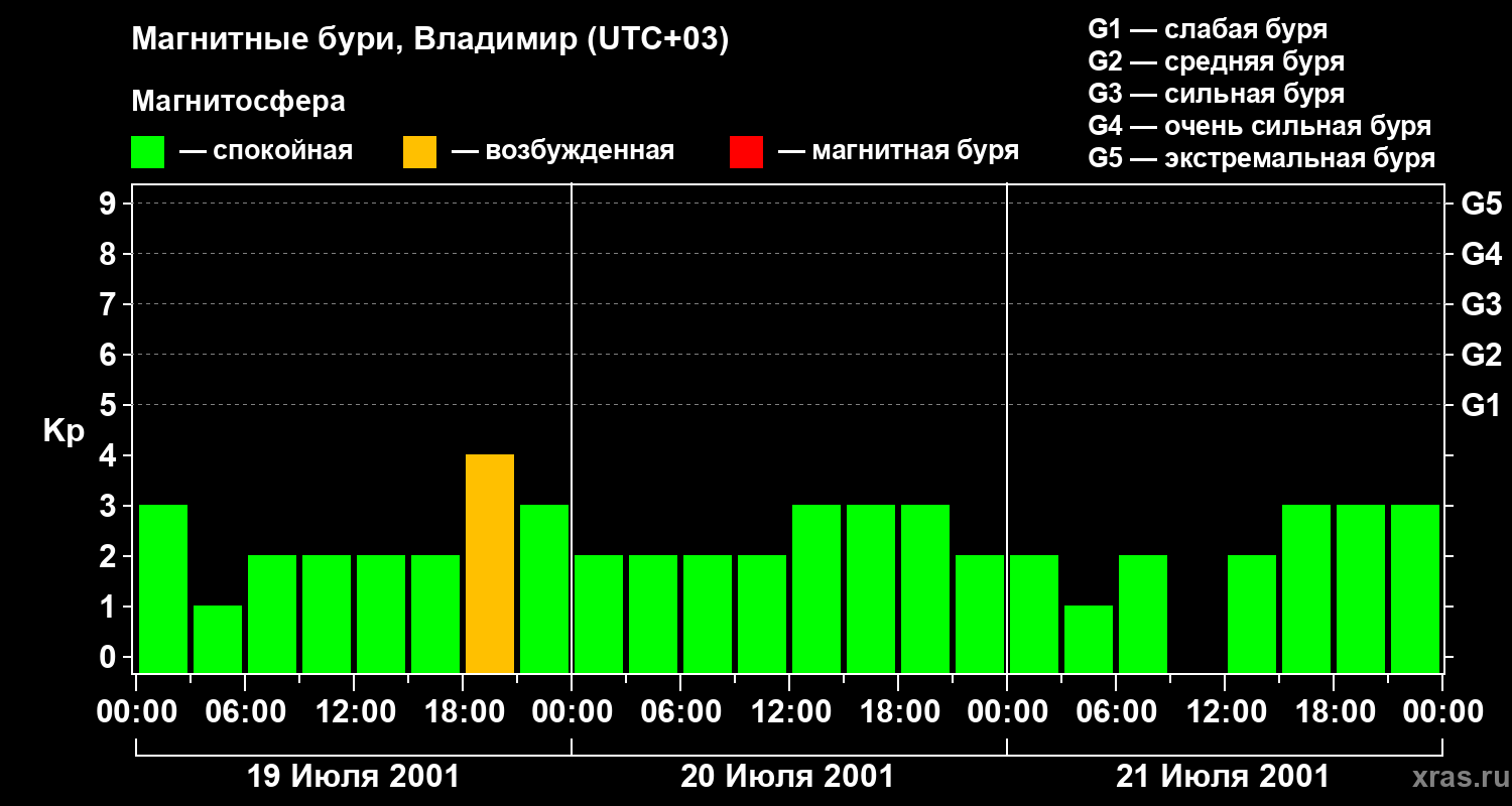 Изменения геомагнитного индекса Kp с 19 по 21 июля 2001 года для средних широт