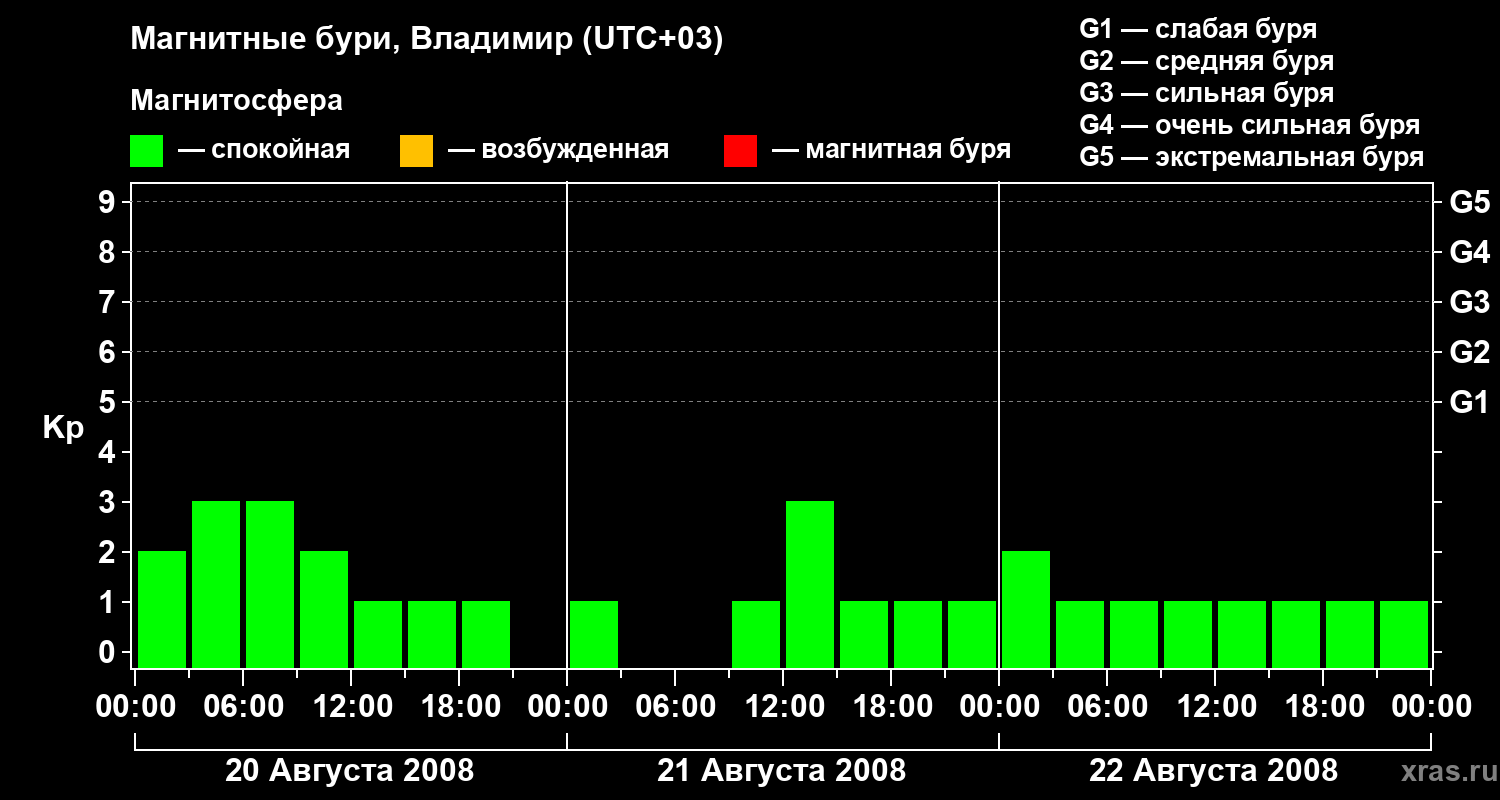 Изменения геомагнитного индекса Kp с 20 по 22 августа 2008 года для средних широт