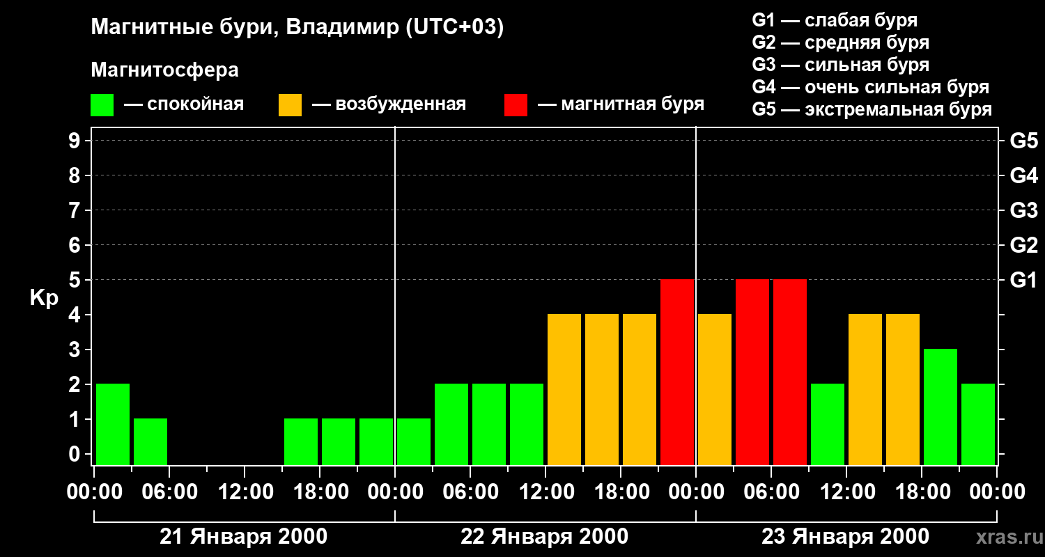Изменения геомагнитного индекса Kp с 21 по 23 января 2000 года для средних широт