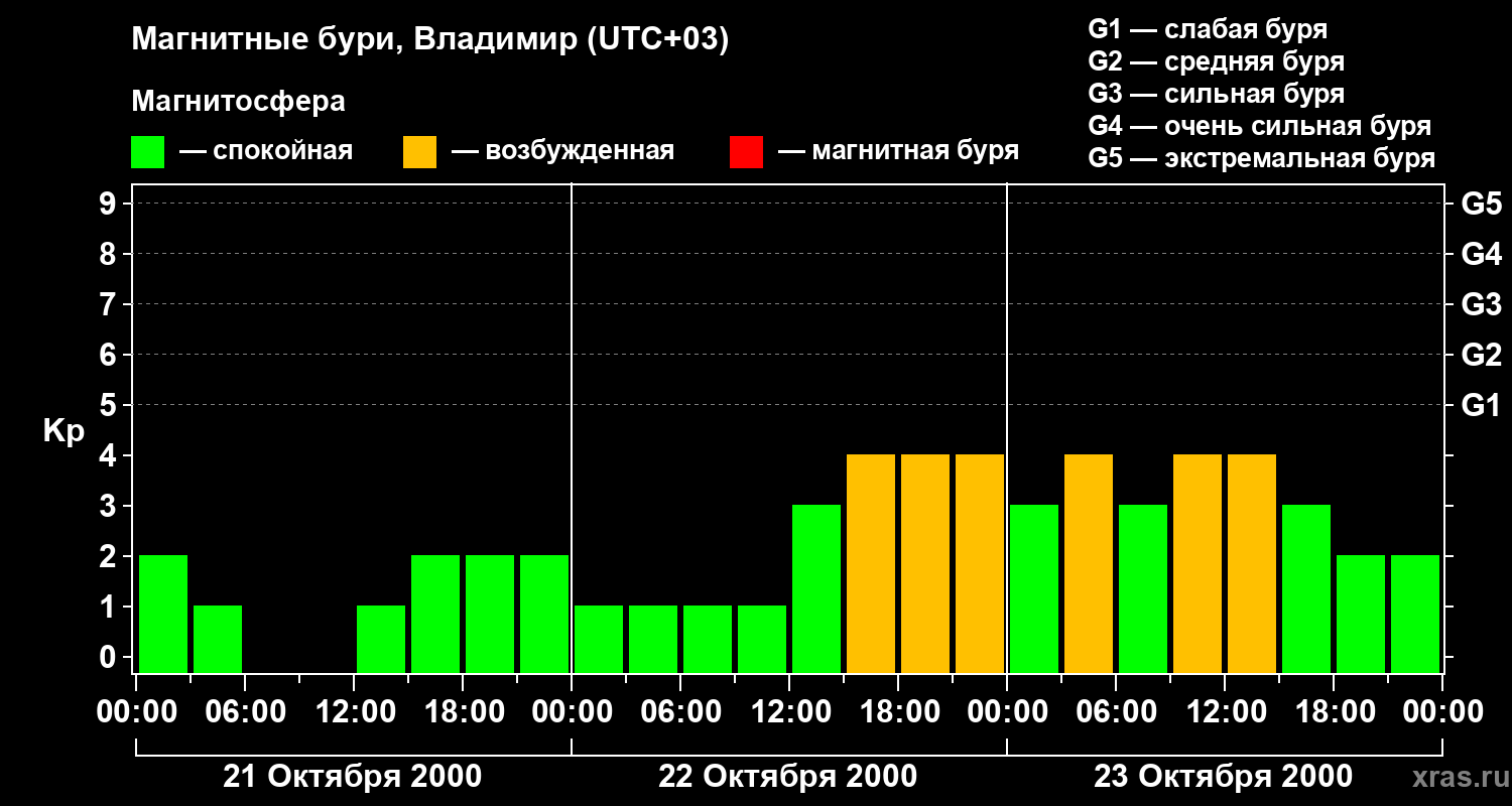 Изменения геомагнитного индекса Kp с 21 по 23 октября 2000 года для средних широт