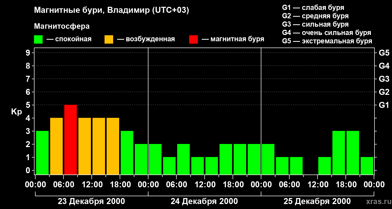 Изменения геомагнитного индекса Kp с 23 по 25 декабря 2000 года для средних широт