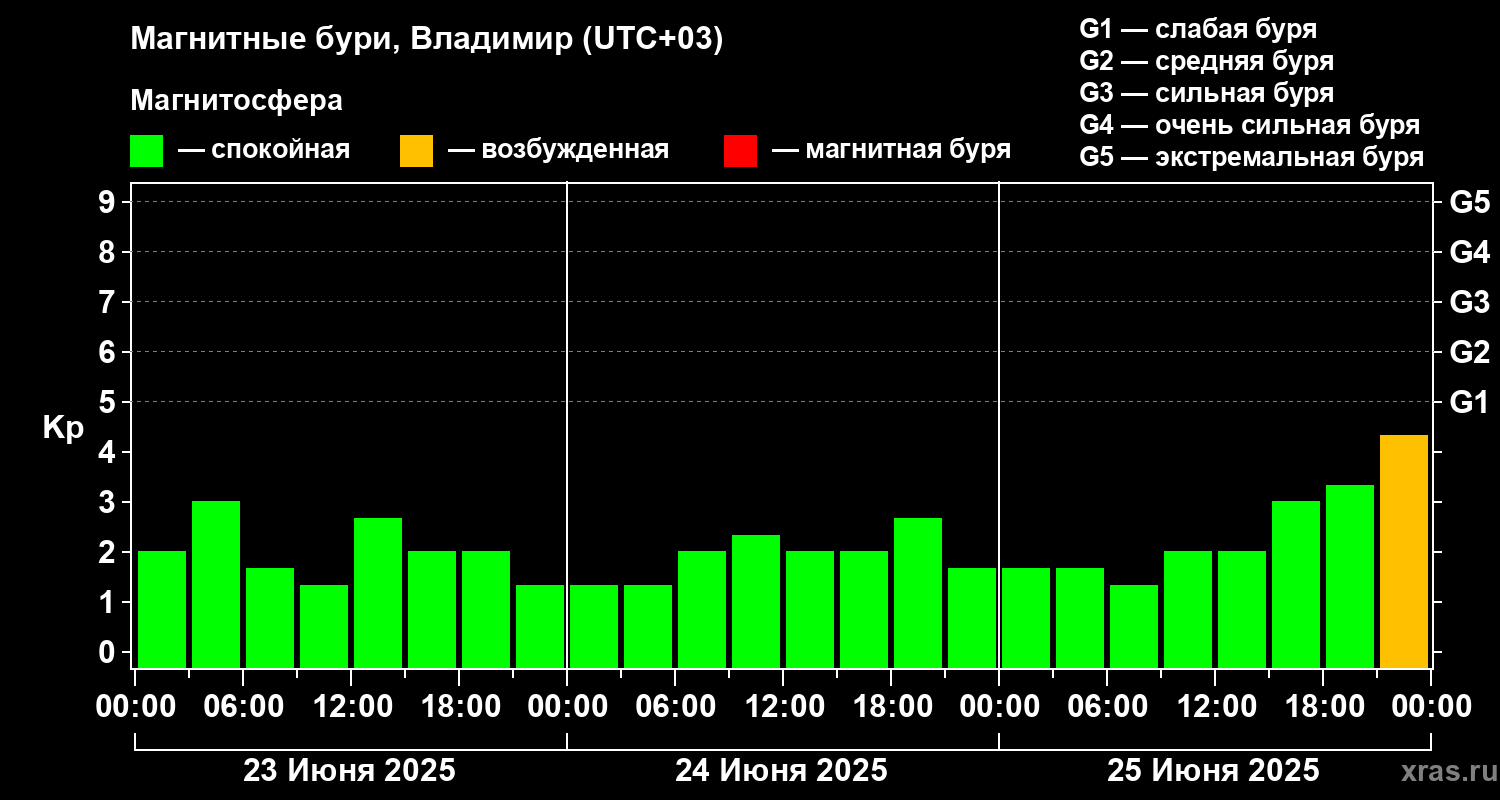 Изменения геомагнитного индекса Kp с 23 по 25 июня 2025 года для средних широт
