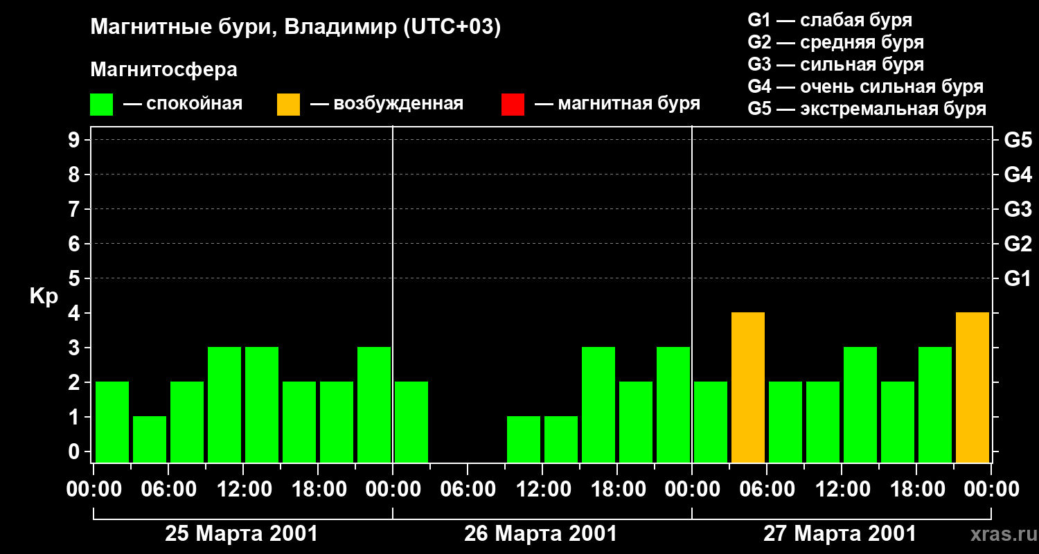 Изменения геомагнитного индекса Kp с 25 по 27 марта 2001 года для средних широт