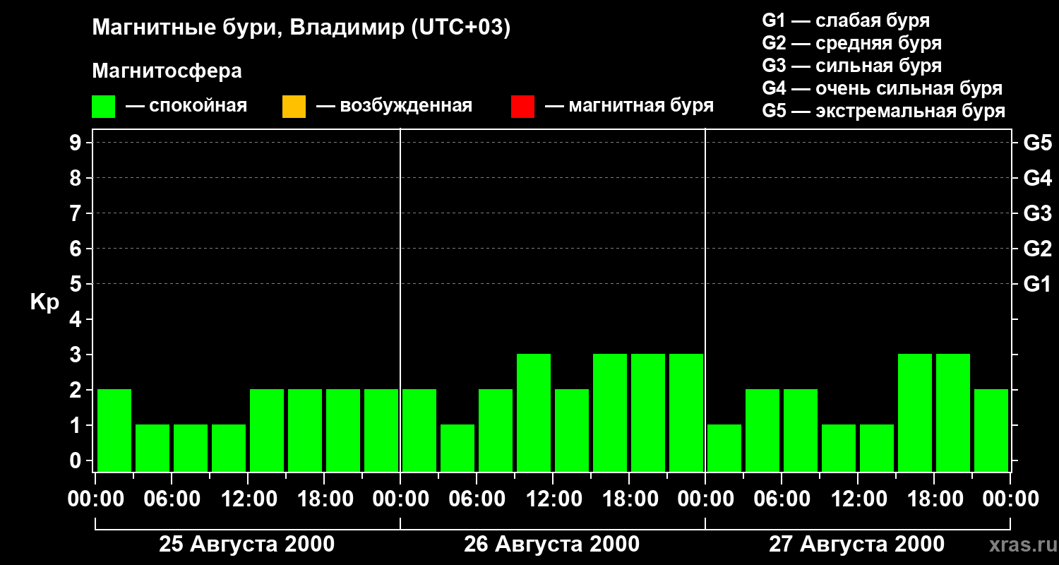 Изменения геомагнитного индекса Kp с 25 по 27 августа 2000 года для средних широт