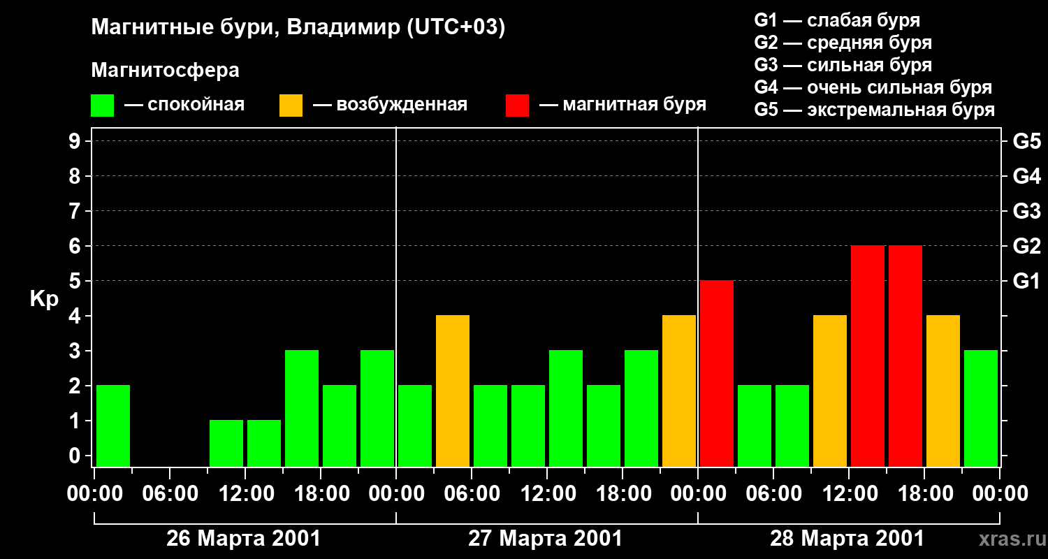 Изменения геомагнитного индекса Kp с 26 по 28 марта 2001 года для средних широт