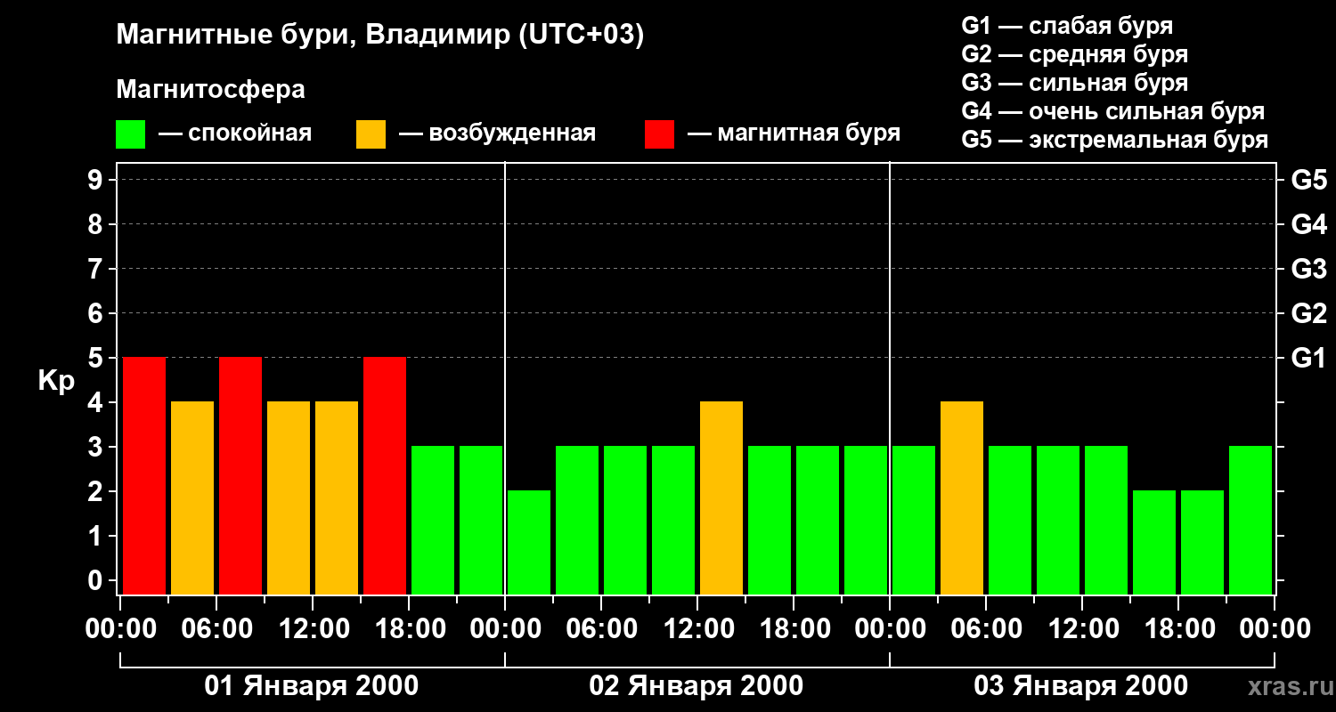 Изменения геомагнитного индекса Kp с 1 по 3 января 2000 года для средних широт
