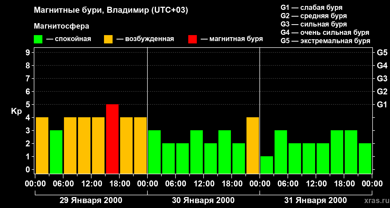Изменения геомагнитного индекса Kp с 29 по 31 января 2000 года для средних широт