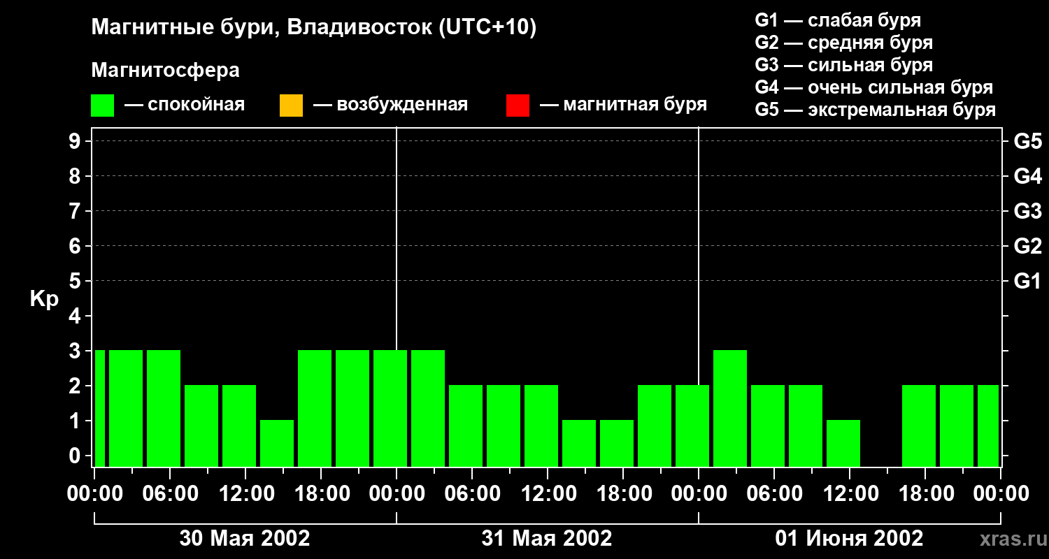 Изменения геомагнитного индекса Kp с 30 мая по 1 июня 2002 года для средних широт