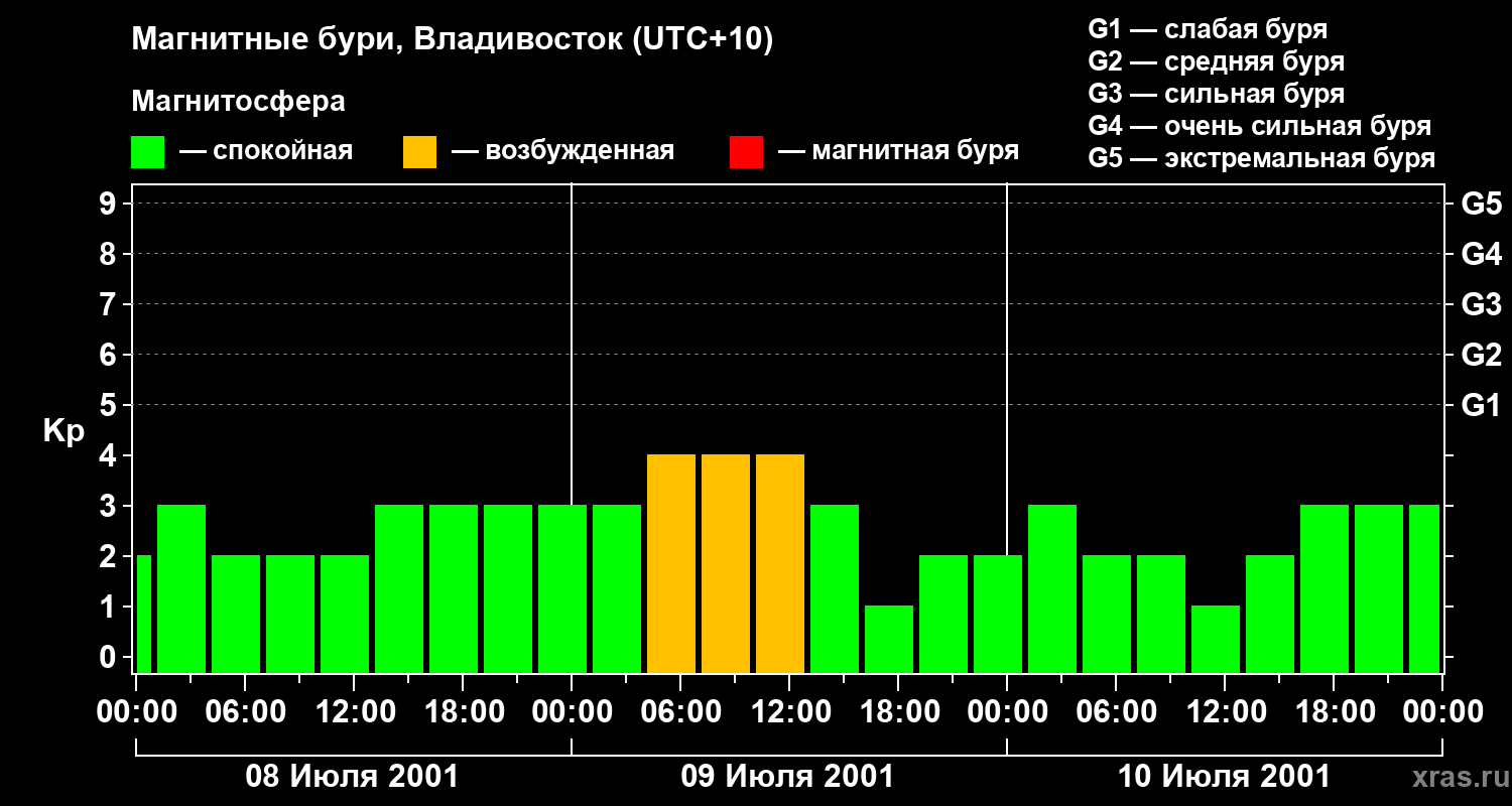 Изменения геомагнитного индекса Kp с 8 по 10 июля 2001 года для средних широт