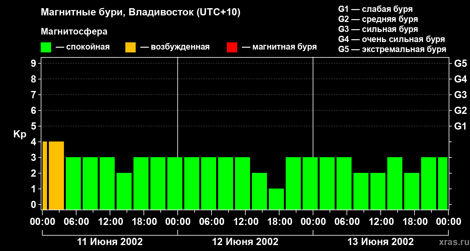 Изменения геомагнитного индекса Kp с 11 по 13 июня 2002 года для средних широт