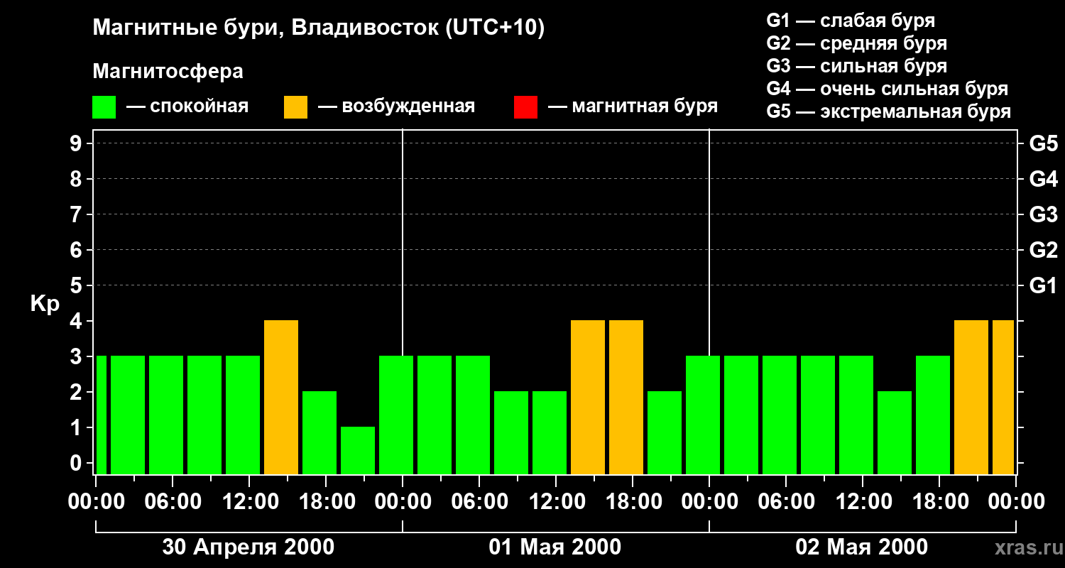 Изменения геомагнитного индекса Kp с 30 апреля по 2 мая 2000 года для средних широт