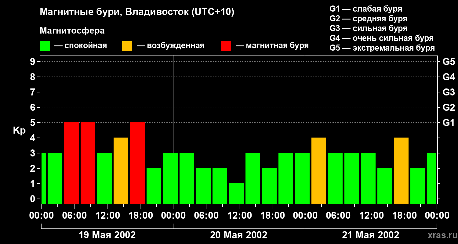 Изменения геомагнитного индекса Kp с 19 по 21 мая 2002 года для средних широт