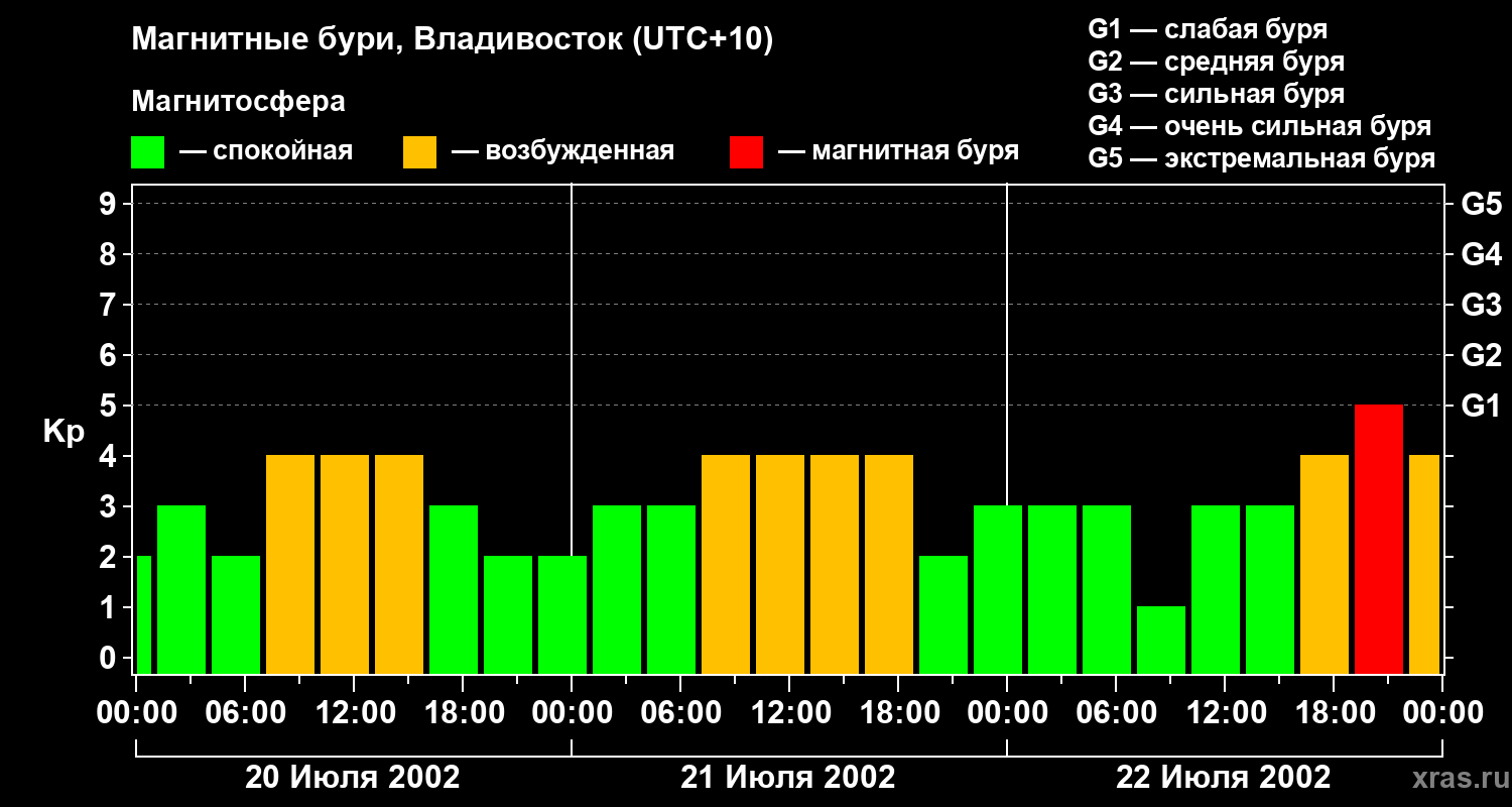 Изменения геомагнитного индекса Kp с 20 по 22 июля 2002 года для средних широт