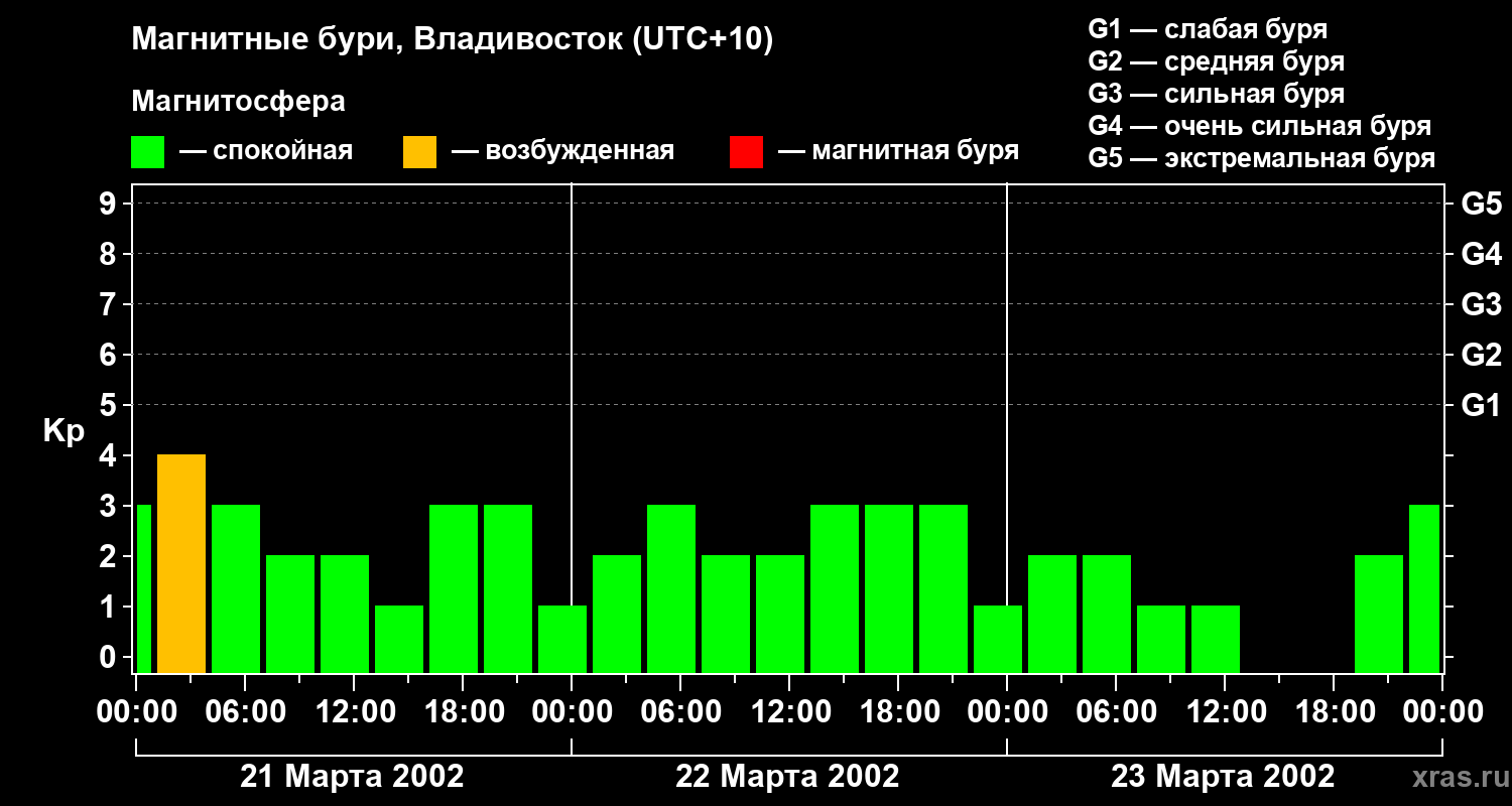 Изменения геомагнитного индекса Kp с 21 по 23 марта 2002 года для средних широт