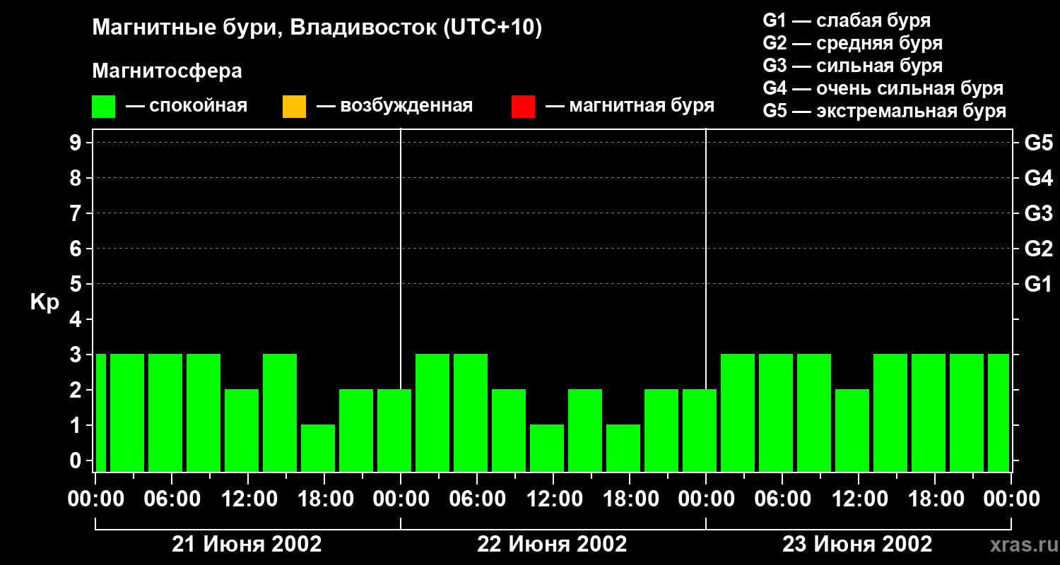Изменения геомагнитного индекса Kp с 21 по 23 июня 2002 года для средних широт