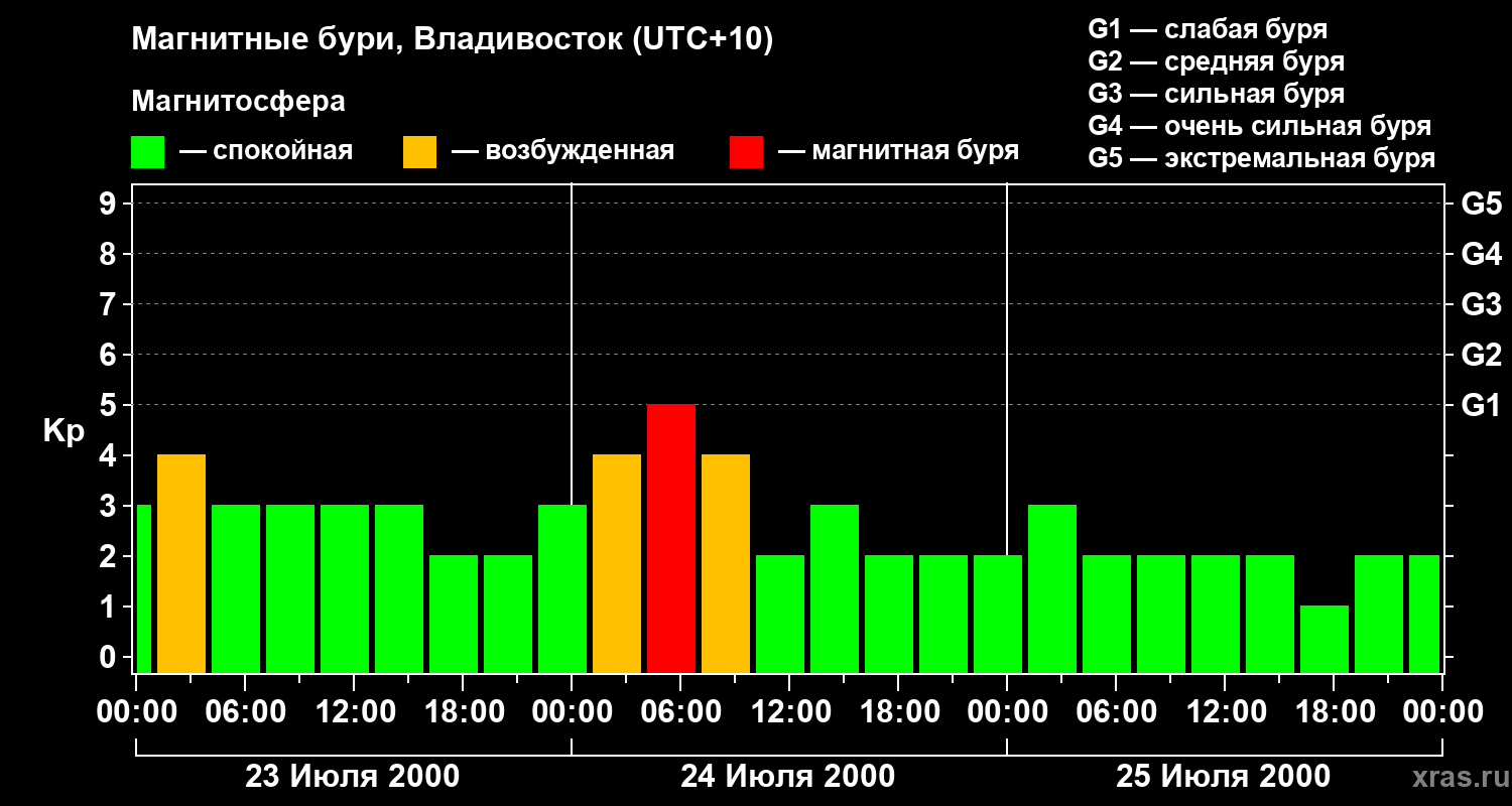 Изменения геомагнитного индекса Kp с 23 по 25 июля 2000 года для средних широт