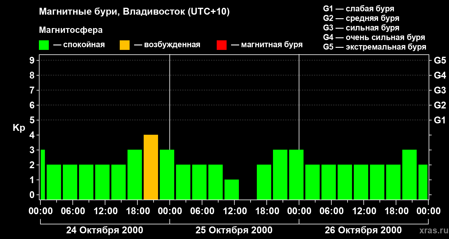 Изменения геомагнитного индекса Kp с 24 по 26 октября 2000 года для средних широт