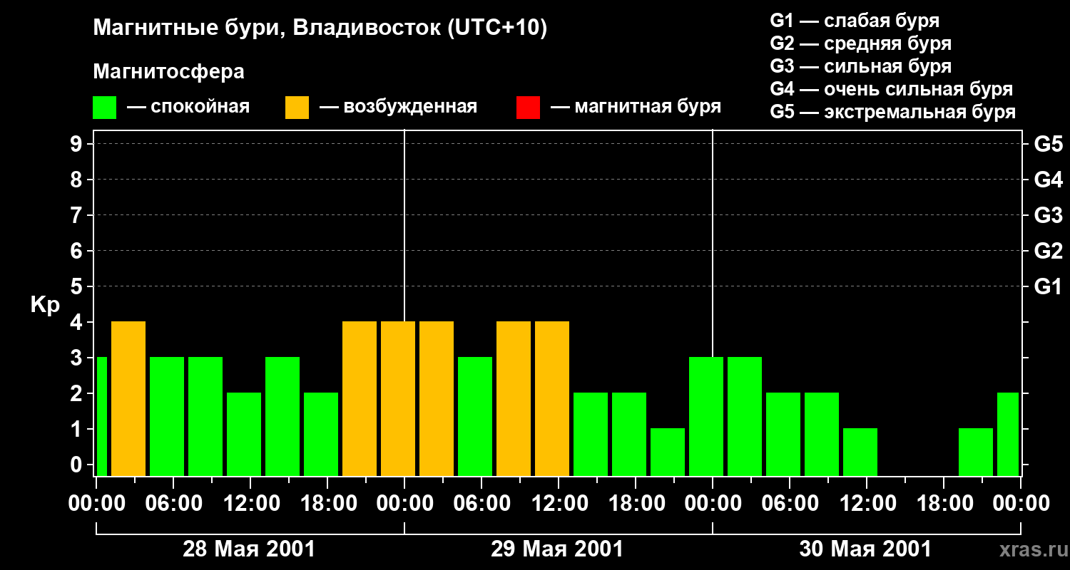 Изменения геомагнитного индекса Kp с 28 по 30 мая 2001 года для средних широт