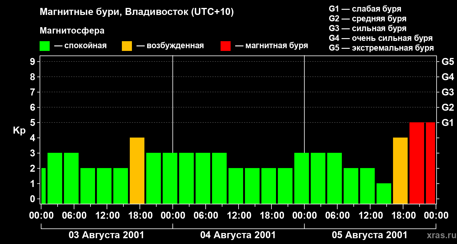 Изменения геомагнитного индекса Kp с 3 по 5 августа 2001 года для средних широт