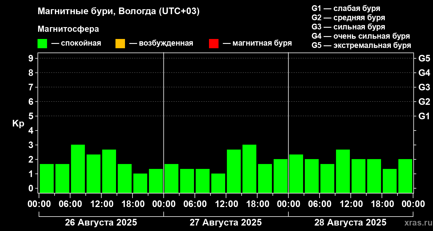 Изменения геомагнитного индекса Kp с 26 по 28 августа 2025 года для средних широт