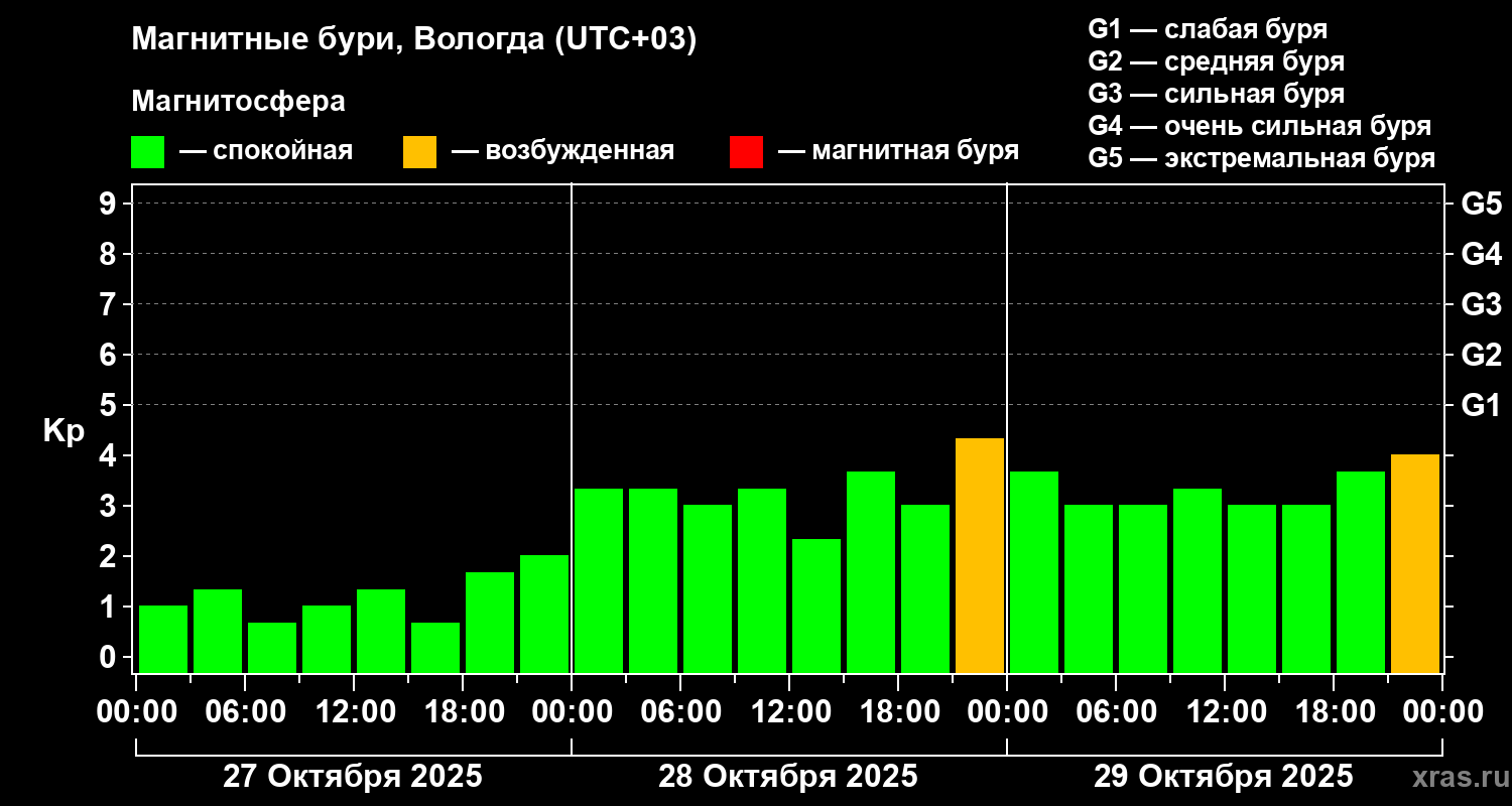 Изменения геомагнитного индекса Kp с 27 по 29 октября 2025 года для средних широт