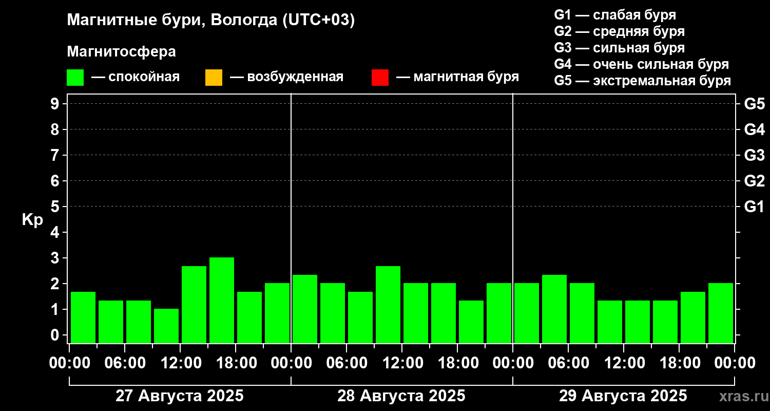 Изменения геомагнитного индекса Kp с 27 по 29 августа 2025 года для средних широт