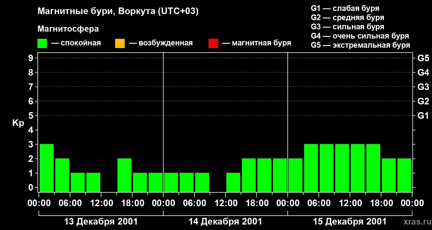 Изменения геомагнитного индекса Kp с 13 по 15 декабря 2001 года для средних широт