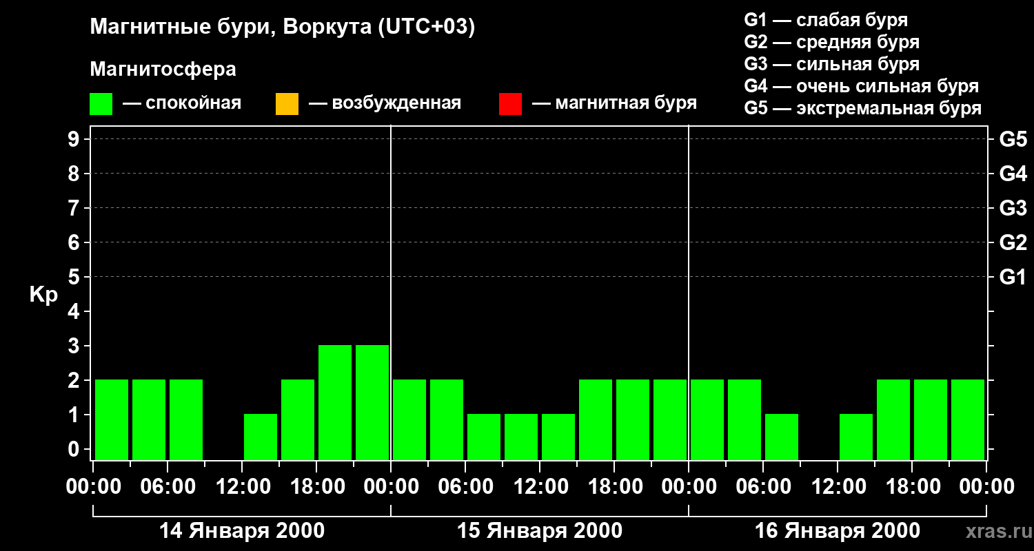 Изменения геомагнитного индекса Kp с 14 по 16 января 2000 года для средних широт