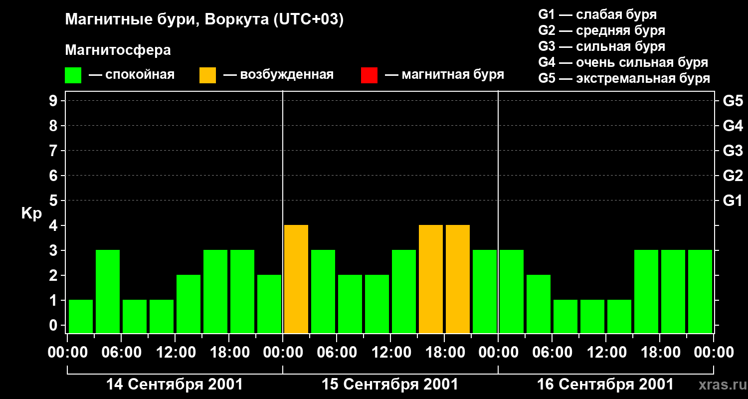 Изменения геомагнитного индекса Kp с 14 по 16 сентября 2001 года для средних широт