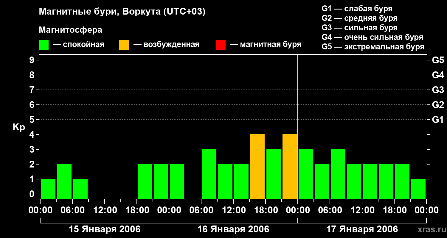 Изменения геомагнитного индекса Kp с 15 по 17 января 2006 года для средних широт