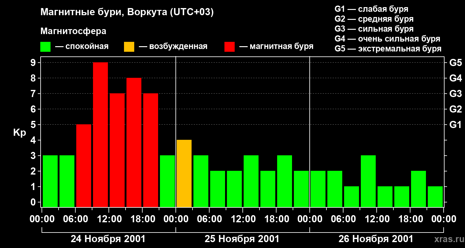 Изменения геомагнитного индекса Kp с 24 по 26 ноября 2001 года для средних широт