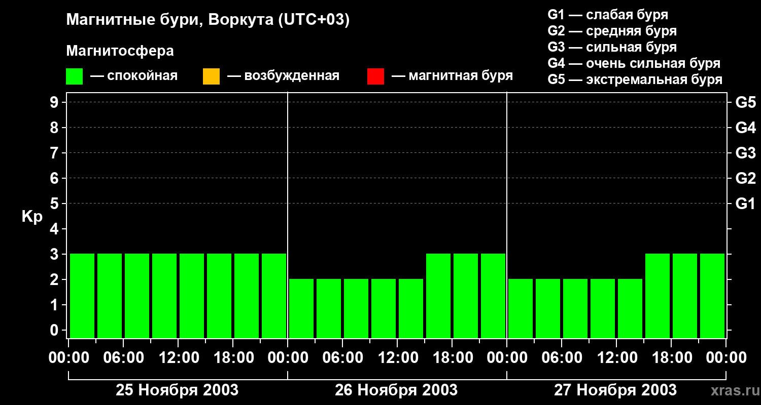Изменения геомагнитного индекса Kp с 25 по 27 ноября 2003 года для средних широт