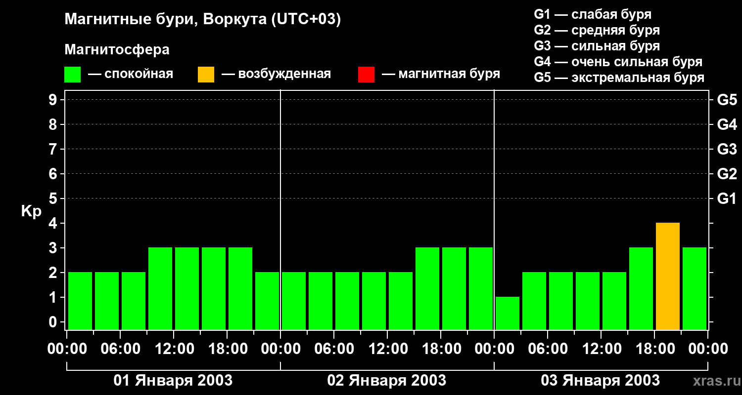 Изменения геомагнитного индекса Kp с 1 по 3 января 2003 года для средних широт