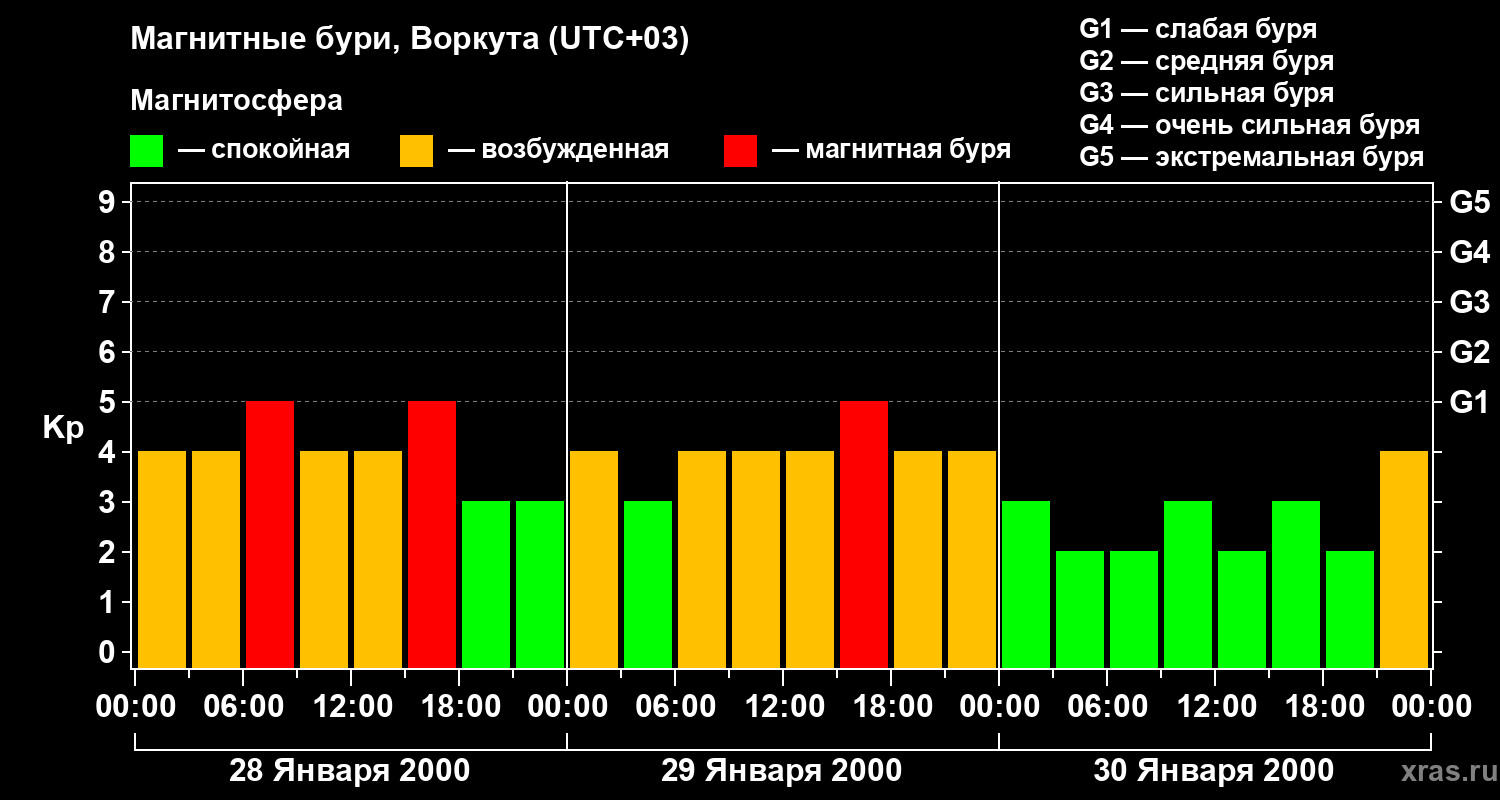 Изменения геомагнитного индекса Kp с 28 по 30 января 2000 года для средних широт