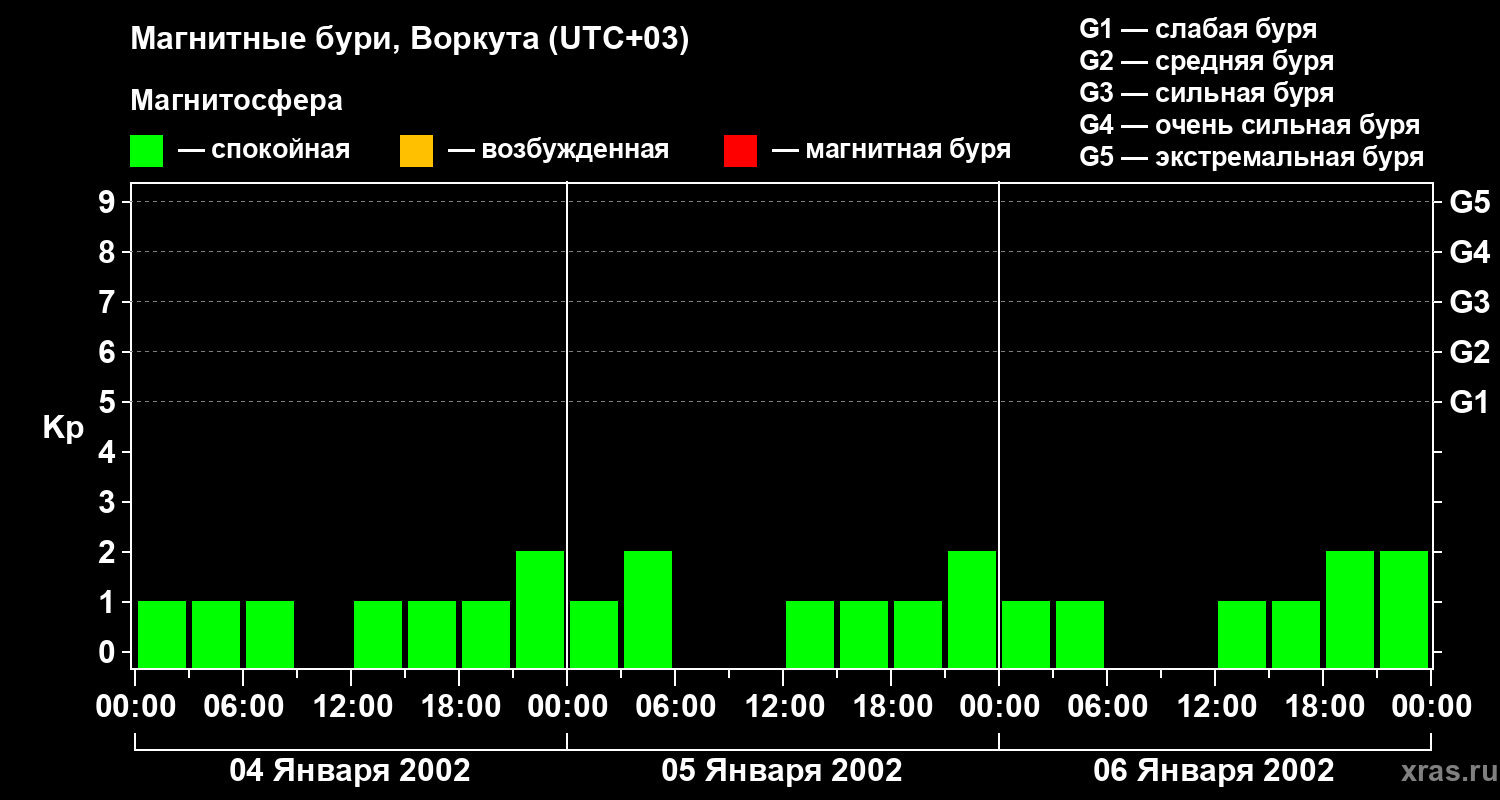Изменения геомагнитного индекса Kp с 4 по 6 января 2002 года для средних широт
