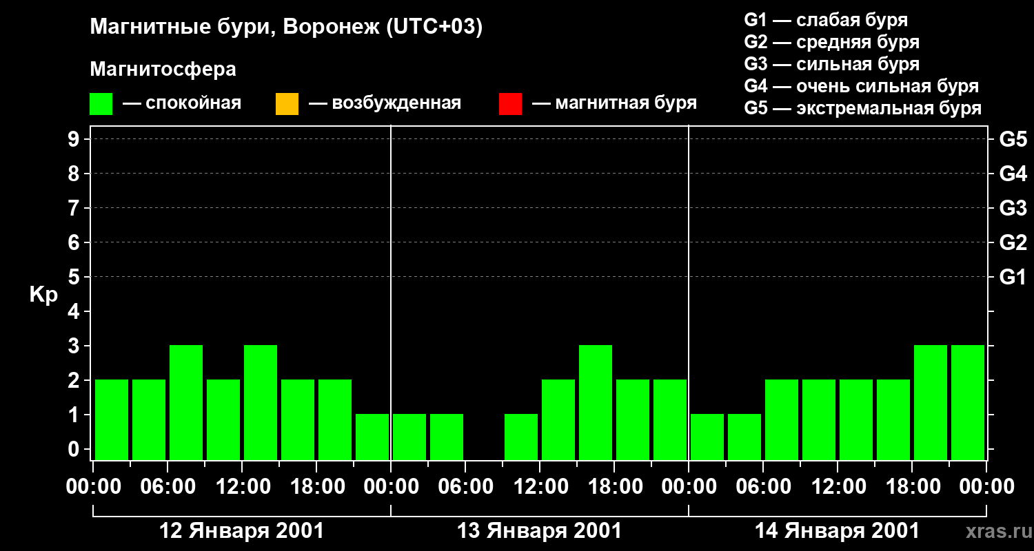 Изменения геомагнитного индекса Kp с 12 по 14 января 2001 года для средних широт