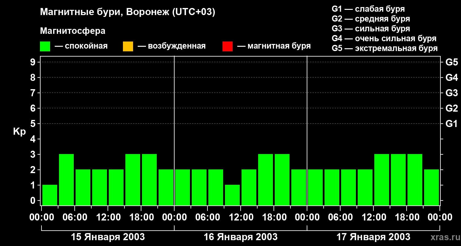 Изменения геомагнитного индекса Kp с 15 по 17 января 2003 года для средних широт