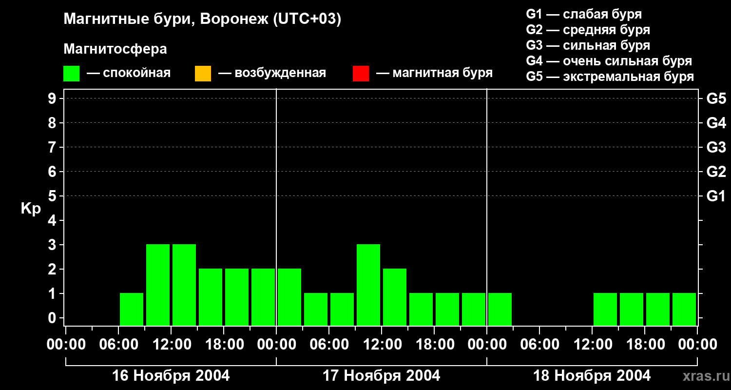 Изменения геомагнитного индекса Kp с 16 по 18 ноября 2004 года для средних широт